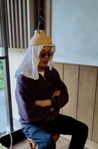 岡山の備前焼の素焼きの器を使い、頭のてっぺん「百会(ひゃくえ)」のツボにお灸を施します。