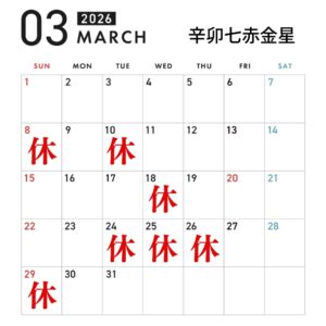 3月のお休み 8日(日)ウェルネスプラスプレミアムセミナー出席、 10日(火)、18日(水)、 24日(火)、25日(水)、26日(木)、 29日(日)王醫塾
